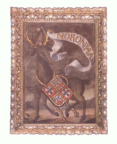 Ecartelé : aux I et IV d'argent à cinq écus d'azur posés en croix, chargés chacun de cinq besants du champ; à la bordure de gueules chargée de sept châteaux d'or ; aux II et III de gueules au château de trois tours d'or, le champ chapé ployé d'argent à deux lions affrontés de pourpre, armés et lampassés de gueules; à la bordure componée d'or et de vairé de gueules et d'argent de 20 pièces