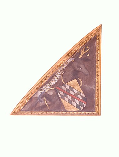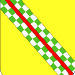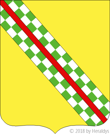 d'or à une bande échiqueté (en bande) de sinople et d'argent de cinq tires, à [une cotice] un filet en bande de gueules brochante