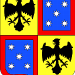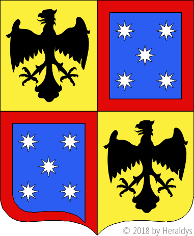 écartelé: aux 1 et 4 d'or à une aigle de sable; aux 2 et 3 d'azur à cinq étoiles de huit rais d'argent, à la bordure de gueules chargée de huit flanchis d'or