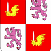 écartelé aux 1 et 4 de gueules à une main ailée d'or tenant une épée d'argent garnie d'or; aux 2 et 3 d'argent à un lion de pourpre, armé et lampassé de gueules