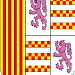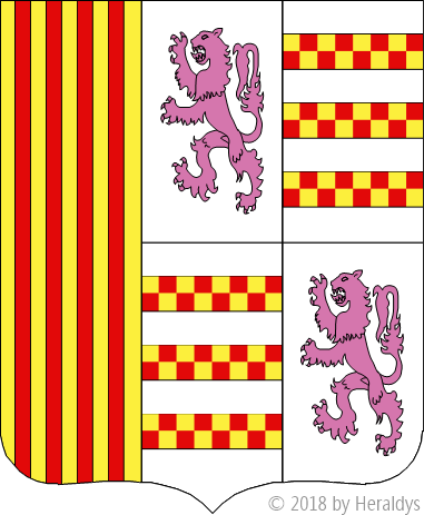 tiercé en pal: au 1 d'or à quatre pals de gueules; au 2 coupé d'argent au lion de pourpre et d'argent à trois fasces échiquetées d'or et de gueules de huit tires; au 3 coupé d'argent à trois fasces échiquetées d'or et de gueules de huits tires et d'argent au lion de pourpre