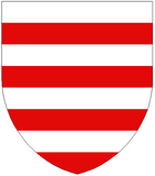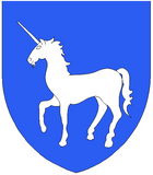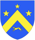 "D'azur à un chevron d'or, accompagné en chef de trois étoiles rangées du même et en pointe d'un lévrier courant aussi d'or colleté de gueules"