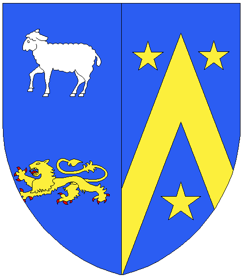 "Parti, au 1 d’azur au lion passant d’or, armé et lampassé de gueules, surmonté d’un mouton aussi passant d’argent, au 2, d'azur, au chevron d'or, acc. de trois étoiles du même.