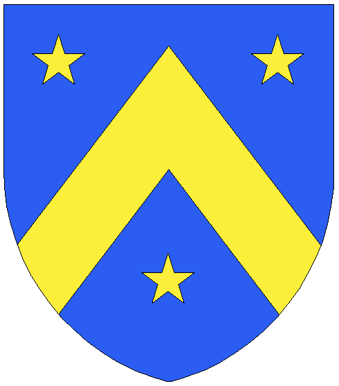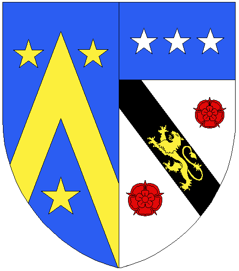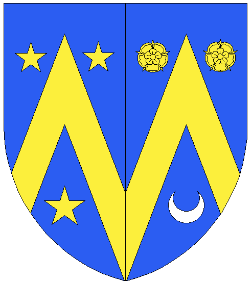 "Parti, au 1 d'azur, au chevron d'or, acc. de trois étoiles du même, au 2 d'azur, au chevron d'or, acc. en chef de deux roses du même et en pointe d'un croissant d'argent."
