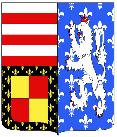 "Parti, au 1 d’azur au chevron d’or accompagné de 3 étoiles du même, au 2 d’argent à la bande de sable chargée d’un lion léopardé d’or, accompagnée de 2 roses de gueules, au chef d’azur chargé de 3 étoiles d’argent."
