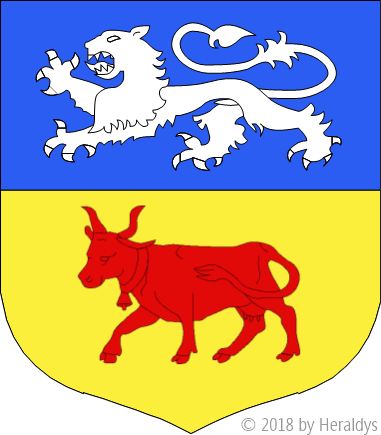 coupé, au Ier d'azur, au lion léopardé d'argent; au 2eme d'or, à la vache passante de gueules.