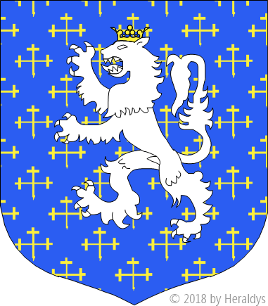 d'azur, semé de croix recroisettées et fichées d'or, au lion d'argent couronné d'or.