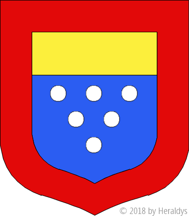 d'azur, à six besants d'argent, au chef d'or et à la bordure de gueules.