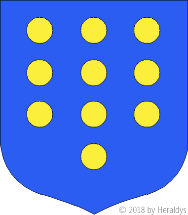d'azur, à dix besants d'or, poses 3, 3, 3 et 1.