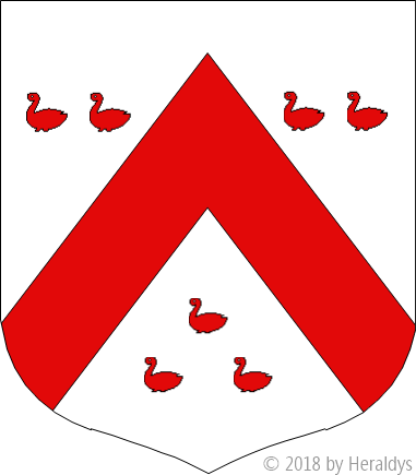 d'argent, au chevron de gueules, accompagné de sept merlettes du même, quatre en chef et trois en pointe; ces dernières posées 1 et 2.