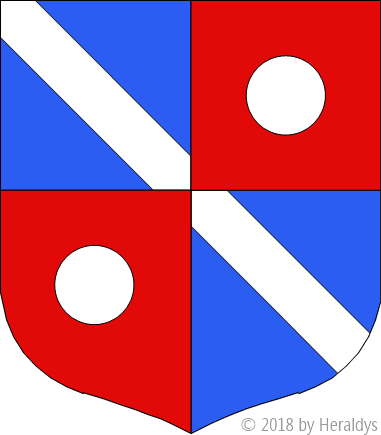 écartelé, aux 1 et 4 d'azur, à la bande d'argent, aux 2 et 3 de gueules, au besant d'argent.