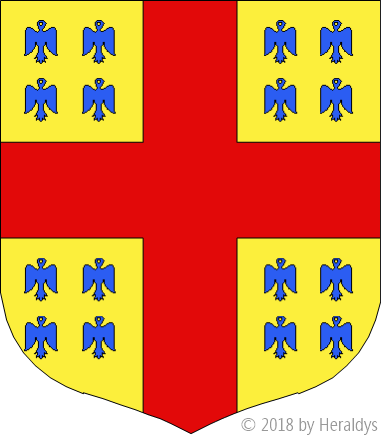 d'or, à la croix de gueules, cantonnée de seize alérions d'azur.