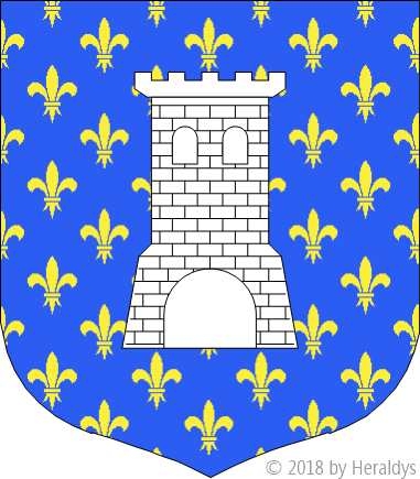 d'azur, semé de fleurs de lis d'or, à la tour d'argent, maçonnée de sable.