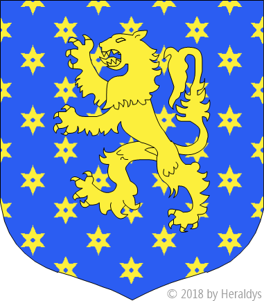 d'azur, semé de molettes d'éperon d'or, au lion [du même.] d'or