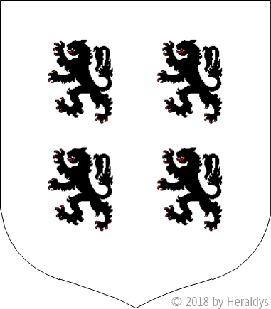 d'argent, à quatre lions cantonnés de sable, armés et lampassés de gueules.