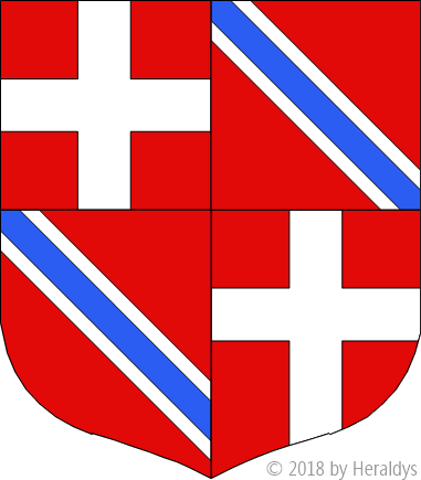 écartelé, aux 1 et 4 de [la religion] gueules à une croix d'argent, aux 2 et 3 de gueules, à la bande d'argent, [chargée] d'une cotice d'azur.