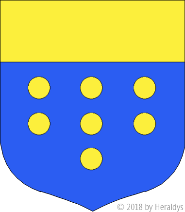 d'azur, à sept besants d'or, posés 3, 3 et 1, au chef d'or.