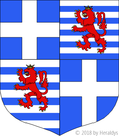 écartelé, aux 1 et 4 d'azur, à la croix d'argent, aux 2 et 3 burelé d'argent et d'azur de 10 pièces, à un lion de gueules, armé, couronné et lampassé d'or, brochant sur le tout, qui est de Lusignan