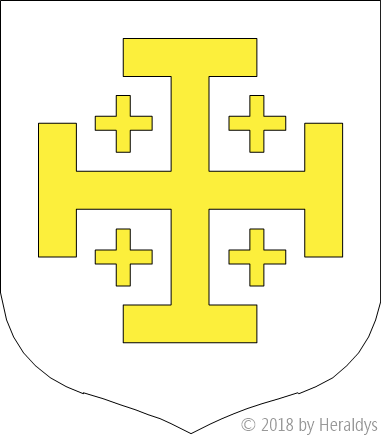 d'argent, à la croix de Jérusalem [alias: croix potencée d'or, cantonnée de quatre croisettes du même] d'or
