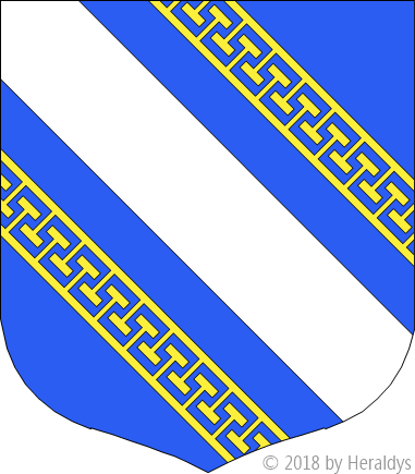 d'azur, à une bande d'argent, accompagnée de deux [doubles cotices] bandes potencées et contre-potencées (1) d'or [de treize pièces]