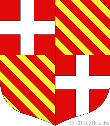 écartelé, aux 1 et 4 [de la religion] de gueules à une croix d'argent, aux 2 et 3 de gueules, à cinq [cotices] bandes d'or.