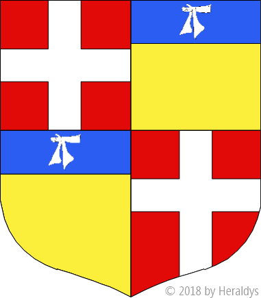 écartelé, aux 1 et 4 [de la religion] de gueules à une croix d'argent, aux 2 et 3 d'or, au chef d'azur, à un dextrochère et sa manipule d'hermine, [brochant sur le tout], qui est de Villiers de l'Isle-Adam.