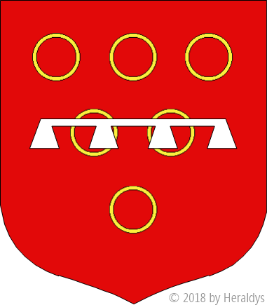 de gueules, à six annelets d'or, au lambel de quatre pendants d'argent en chef