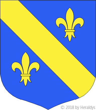 d'azur, à la bande d'or, accompagnée de deux fleurs de lis [du même.] d'or