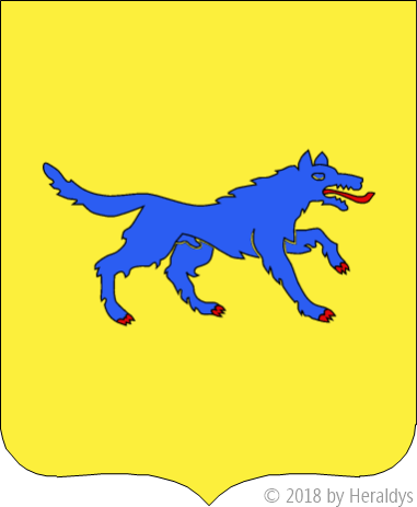 d'or, au loup passant et contourné d'azur, armé et lampassé de gueules.