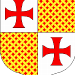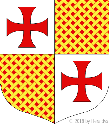 [alias: écartelé [du Temple] d'argent à une croix patée et alaisée de gueules et de gueules fretté d'or]