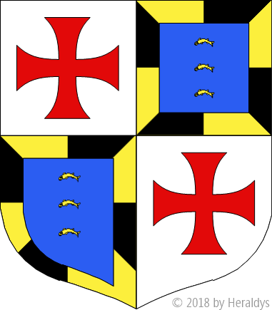 écartelé, aux 1 et 4 [du Temple] d'argent à une croix patée alaisée de gueules, aux 2 et 3 d'azur à trois bars tournés d'or, posés l'un sur l'autre [en demi-cercle], à la bordure [componée] gironnée d'or et de sable de huit pièces.
