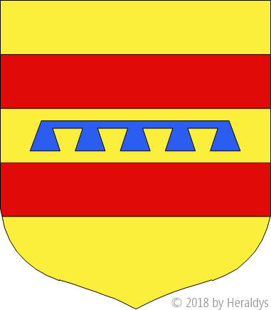 d'or, à deux fasces de gueules, au lambel de cinq pendants d'azur [posé en chef]