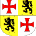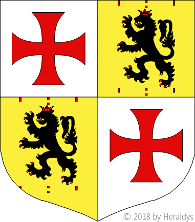 [Alias : écartelé aux 1 et 4 d'argent à une croix patée alaisée de gueules, aux 2 et 3 d'or au lion de sable armé, lampassé et couronné de gueules, accompagné de douze carreaux [du même] de gueules, posés en orle]