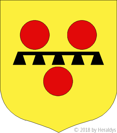 d'or, à trois tourteaux de gueules, au lambel de cinq pendants de sable.
