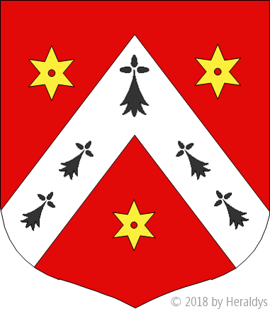 de gueules, au chevron d'argent, chargé de cinq mouchetures d'hermine de sable, et accompagné de trois molettes d'or.