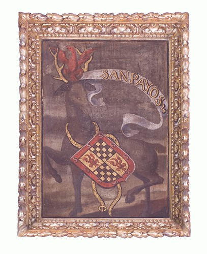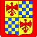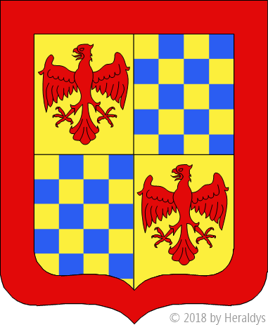 écartelé: aux 1 et 4 d'or à une aigle de gueules; aux 2 et 3 échiqueté d'or et d'azur de 4 tires; l'écu à la bordure de gueules chargé de huit "S" d'argent