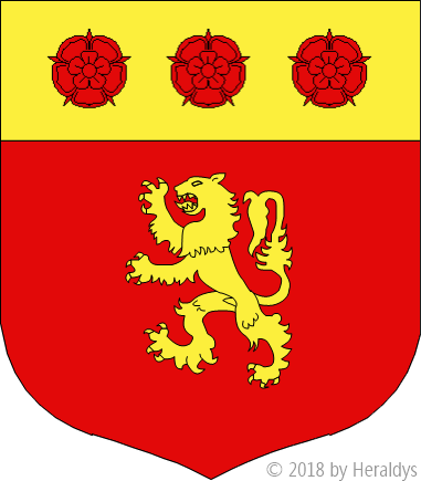 de gueules, au lion d'or, au chef du même, chargé de trois roses du premier, rangées en fasce.