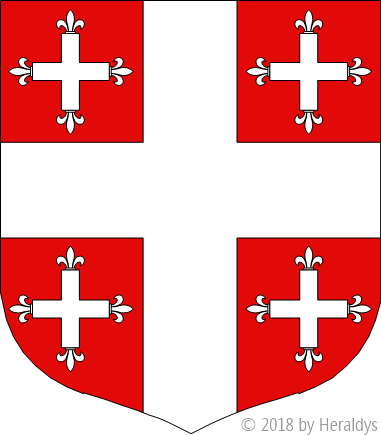 de gueules, à la croix d'argent, cantonnée de quatre croisettes fleuronnées du même.