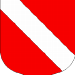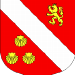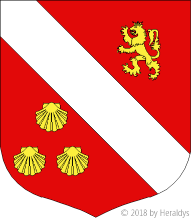 [Alias: de gueules à la bande d'argent accompagnée en chef d'un lion couronné d'or et en pointe de trois coquilles du même, mal ordonnée]