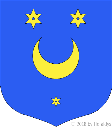 d'azur, au croissant d'or, accompagné de trois molettes du même.