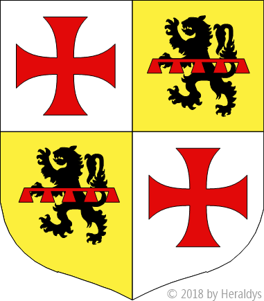 écartelé, aux 1 et 4 [de l'Ordre du Temple] d'argent à une croix patée alaisée de gueules, aux 2 et 3 d'or, au lion de sable, au lambel de cinq pendants de gueules, brochant sur le tout, qui est de Beaujeu.