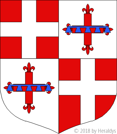 écartelé, aux 1 et 4 [de l'Ordre de Saint-Jean de Jérusalem] de gueules à la croix d'argent, aux 2 et 3 d'argent, à la croix fleuronnée de gueules, au lambel de cinq pendants d'azur.