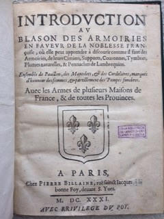 Introduction au blason des armoiries en faveur de la noblesse fraçaise, où elle peut apprendre à discourir comme il faut des Armoiries, de leurs Cimiers, Supports, Couronnes, Tymbres, Plumes naturelles, & Pennaches de Lambrequins.