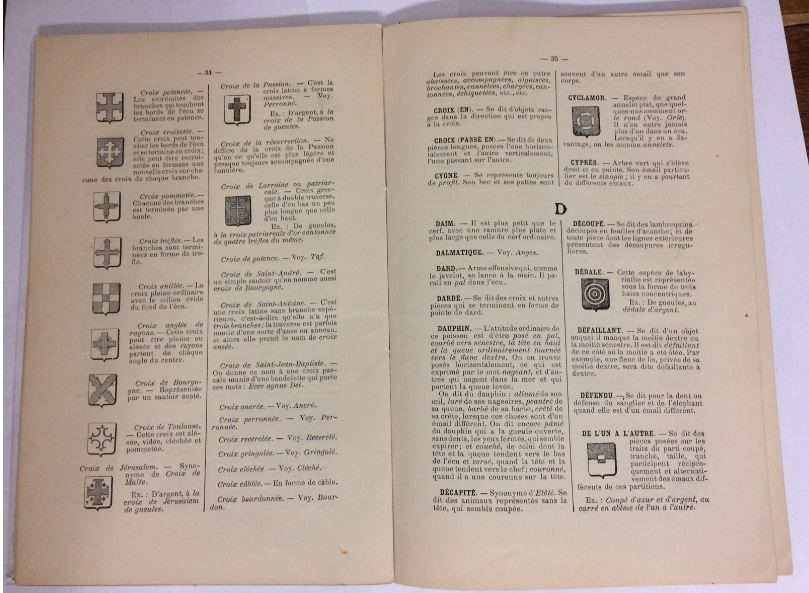 | Couverture imprimée éditeur crème, titre en noir et rouge. Quelques rousseurs sur les plats de la couverture, trace de pliure au coin supérieur gauche du plat inférieur, petit manque de papier au bas du dos, sans gravité, la couverture reste en bon état, intérieur frais et propre, papier à peine jauni, signature de l'ancien propriétaire sur la premiere page, sans page de titre, Texte très original présentant un vocabulaire du blason par ordre alphabétique et abondamment illustré de petites vignettes de blasons. | |