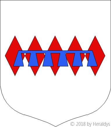 d'argent, à cinq fusées de gueules, rangées en fasce, au lambel de six pendants d'azur.