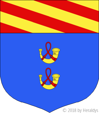 d'azur, à deux cors contournés d'or, enguichés et virolés de gueules, posés l'un sur l'autre, au chef bandé d'or [alias d'argent] et de gueules.
