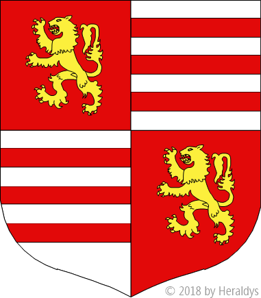 écartelé, aux 1 et 4 de gueules, au lion d'or, aux 2 et 3 d'argent, à trois fasces de gueules.