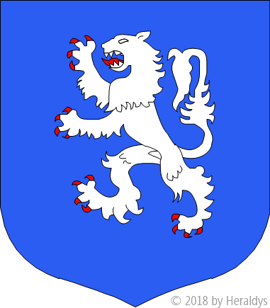 d'azur, au lion d'argent, armé et lampassé de gueules.