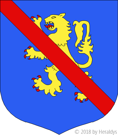 d'azur, au lion d'or, armé et lampassé de gueules, à une cotice de gueules, brochant sur le tout.