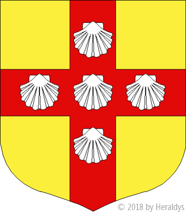 d'or, à la croix de gueules, chargée de cinq coquilles d'argent.